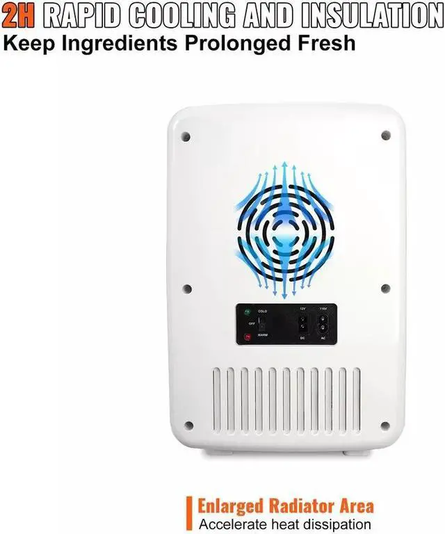 1. This 10L mini fridge has both cool and warm modes, and it can go 64.4 below ambient temperature and 122 above it. The 38db operation will not disturb your life. With home power adapter and 12V DC power cord, this Fridge is ideal for storing food, drinks, breast milk, medicine, cosmetics.