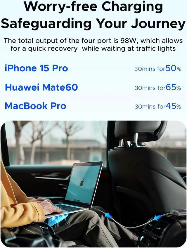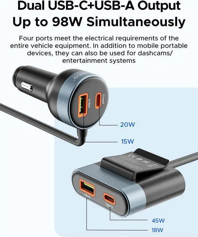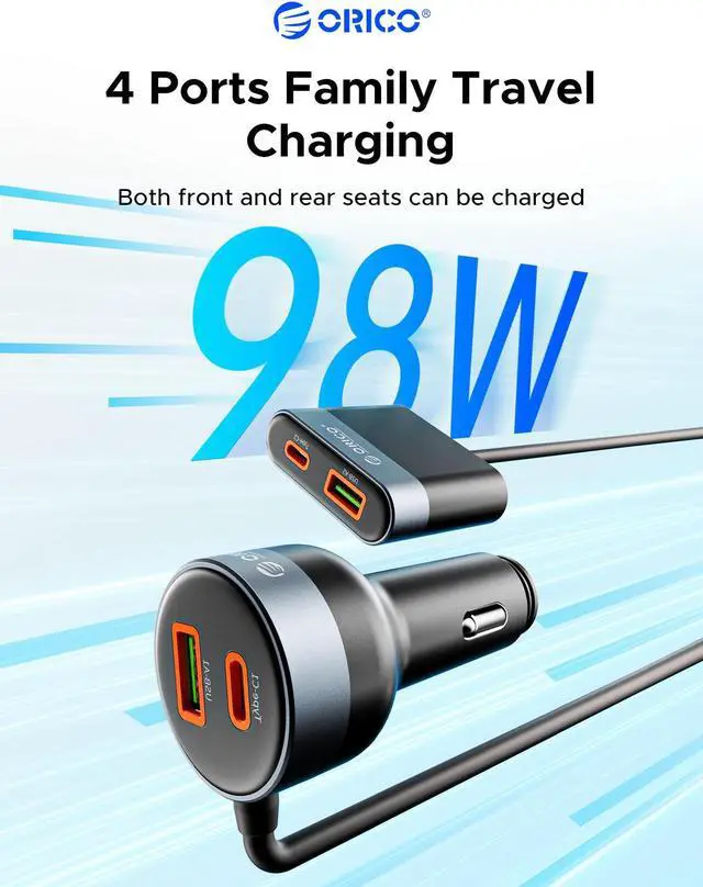 Experience the excellent performance of ORICO car chargers, with over 98W fast charging devices bringing you unprecedented charging speeds. The four port design perfectly meets the electricity needs of the entire vehicle equipment, whether it is a mobile phone, tablet, or other electronic devices, it can charge efficiently at the same time. No choice of car model, universal for cars and trucks, keeping your battery full anytime and anywhere, making your journey more comfortable and worry free. ORICO car charger is your best power companion on the road, making every trip fully charged.