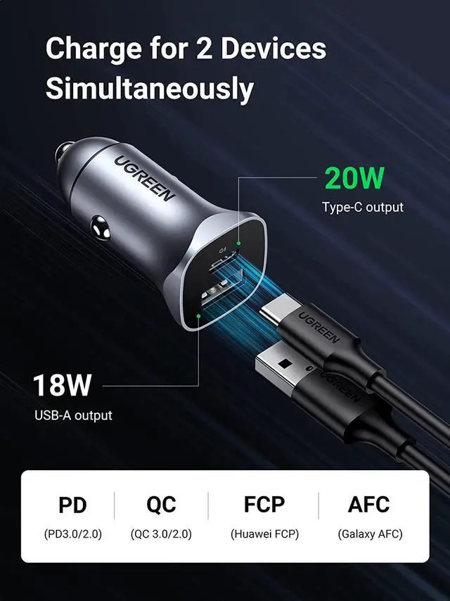 Dual-port Charging: Equipped with 20W Power Delivery USB C Charger and 18W Qualcomm Quick Charge (Total power 24W), UGREEN fast car charger adapter can charge two devices simultaneously. Built-in smart chips automatically assign power to each port when two devices are charged to prevent your devices from being damaged when charging with the massive power input.