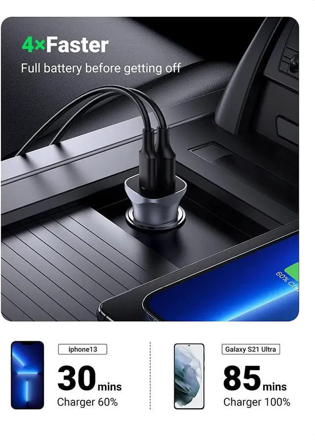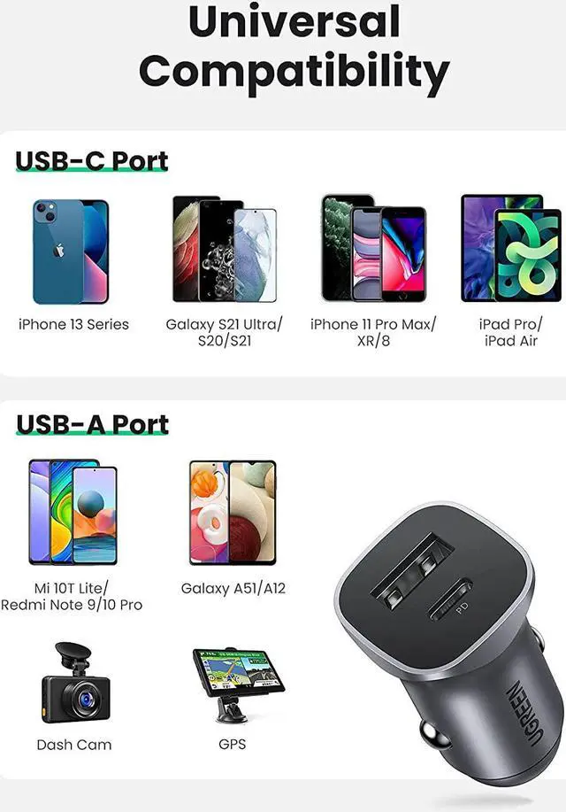 High-speed 20W PD Fast Charger: UGREEN USB C car charger supports the fast charging of your devices. With a power of up to 20W at the PD connection, you can achieve the desired quick-charging effect for your PD-enabled devices. It can fully charge your cell Phone device 60% in 35 minutes.