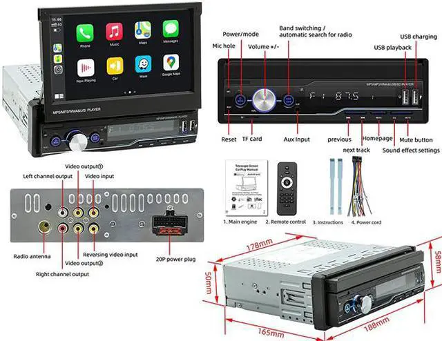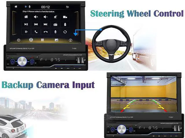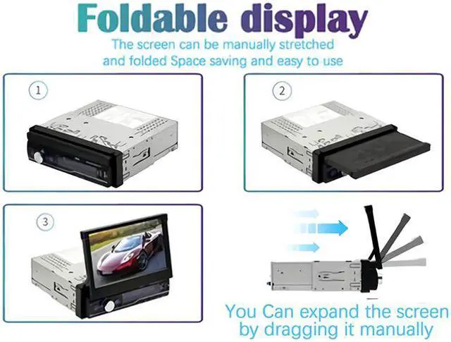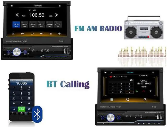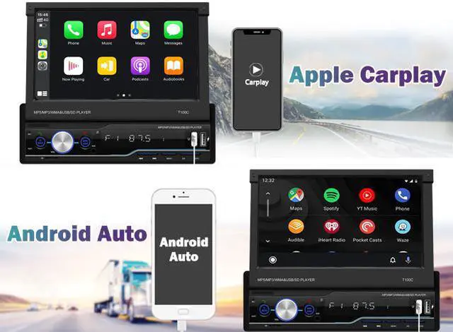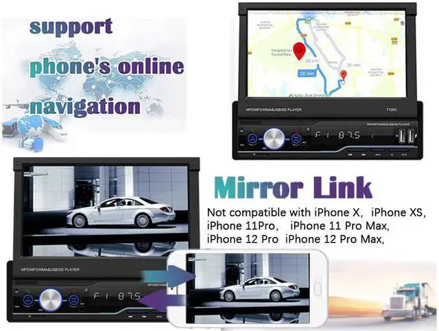Retractable flip out touch screen head unit supports phone link.For iphone,select i-Mirror in the settings, then use your phones original USB cable(Not compatible with high-resolution IOS phones and iPhone x);For Android,select A-link in the settings and follow the prompts to download and install the app