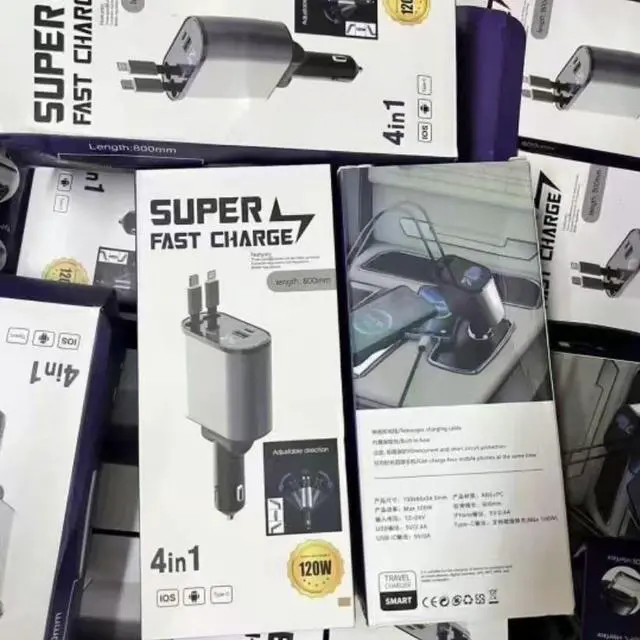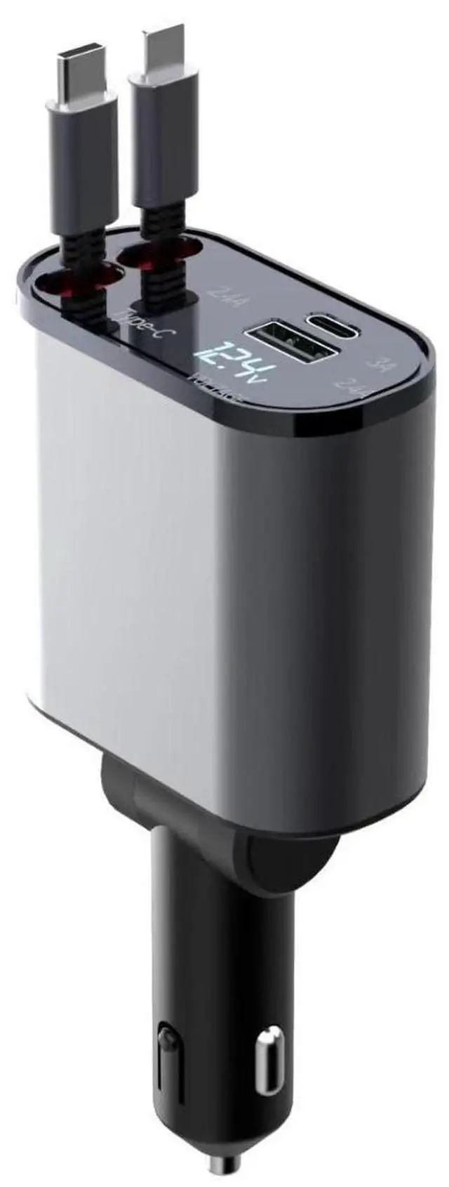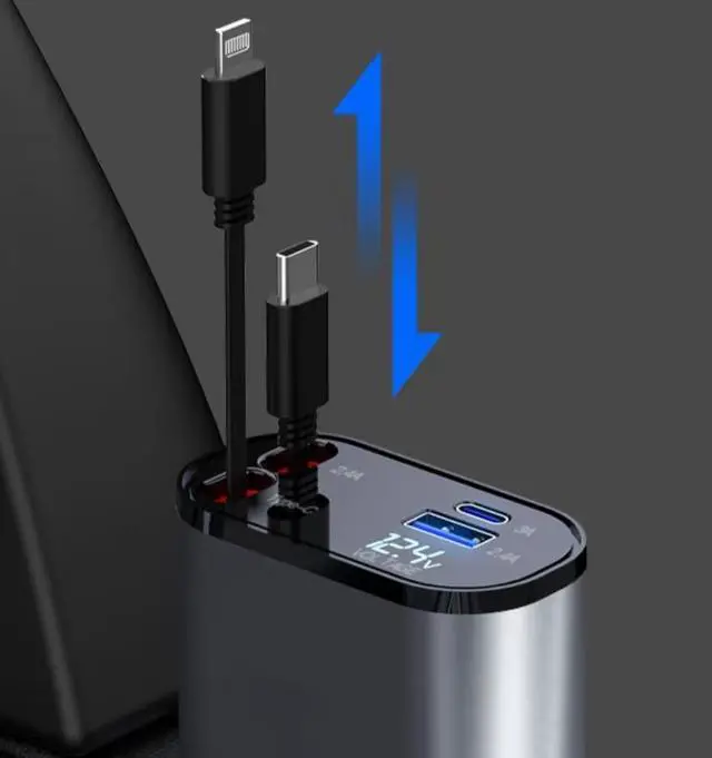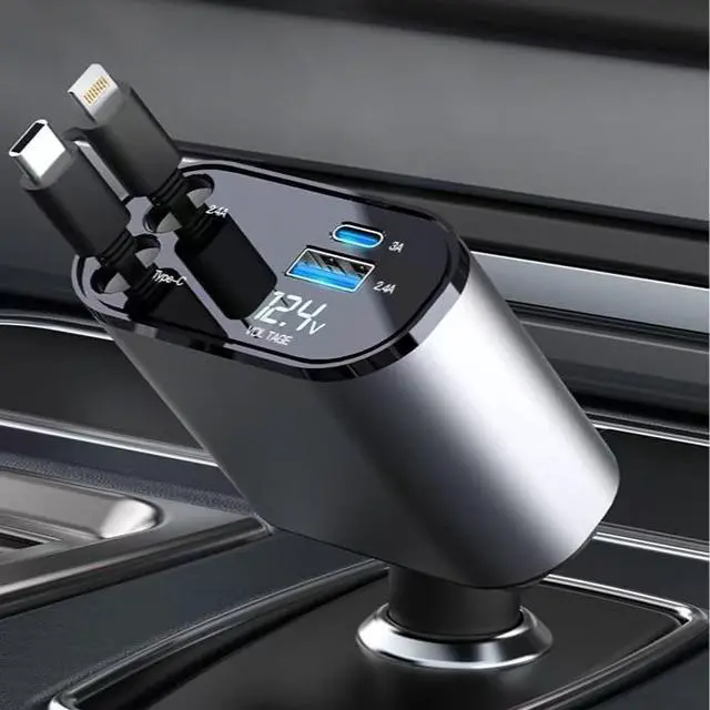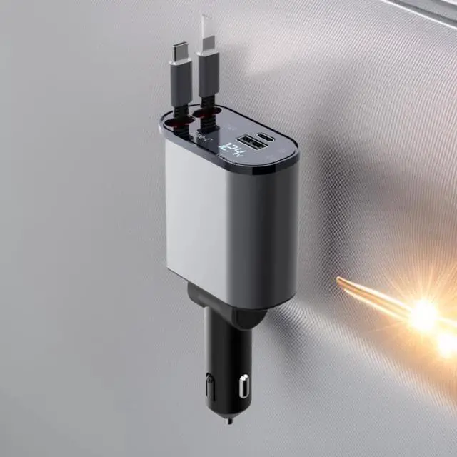 DIXSG car charger with telescopic cable, four-car charger, super fast charging, car cigarette lighter, mobile phone charger head