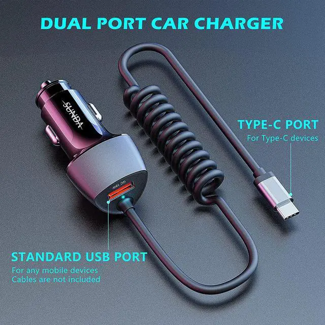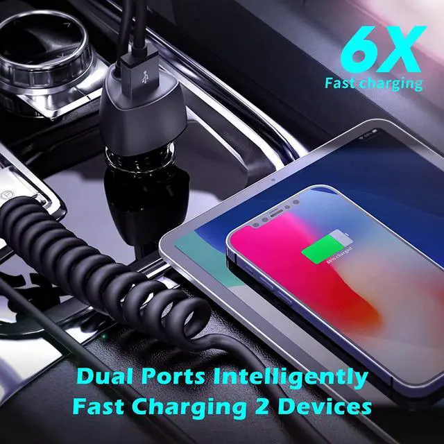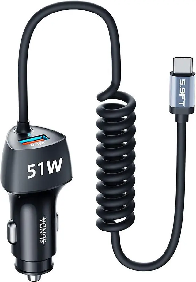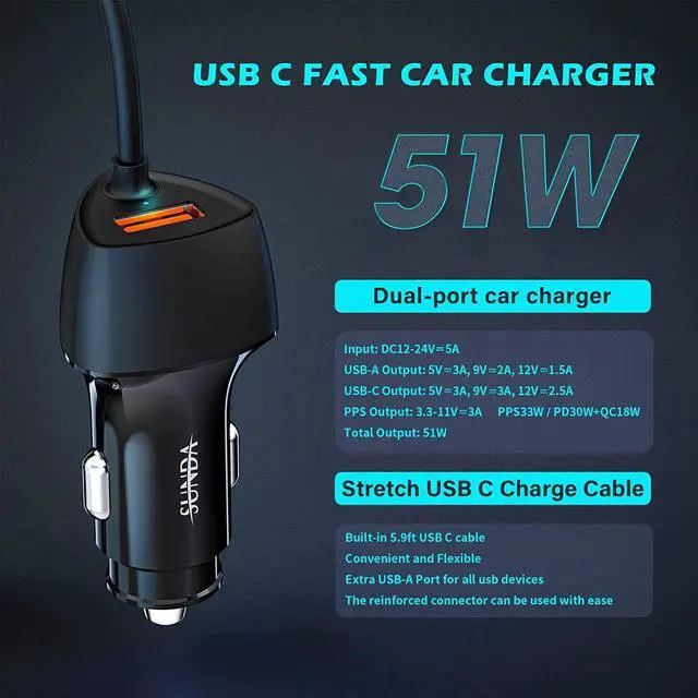 Ports Intelligently Fast Charging]: 51W fast charger USB Type-C PPS 33W /PD 30W and QC 18W USB device charger for your vehicle. Cigarette lighter socket with built-in 5.9 -foot cable that can simultaneously charge devices in the front and rear seats. 6X charging speed. Fast-charge two devices at the same time. Intelligently distributes power to provide optimal charging.
