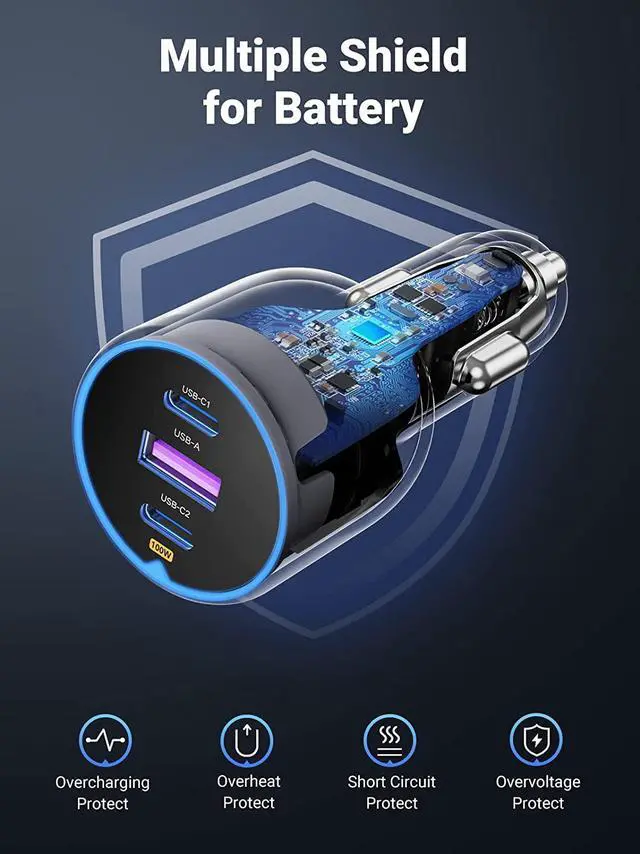 Three Port Fast Charging: Equipped with one USB A port and two type-c ports, the UGREEN 130W USB C car charger charges 3 devices simultaneously. The dual PD Car Charger has 3 ports for high-speed charging your devices. Supports PD 3.0, QC 4.0, and many other fast charging protocols. The fast charge car adapter charges an iPhone 13 to 100% in about 1.5 hours, an iPad Pro/Air in around 2 hours, or a MacBook Pro in less than 2 Hours.
