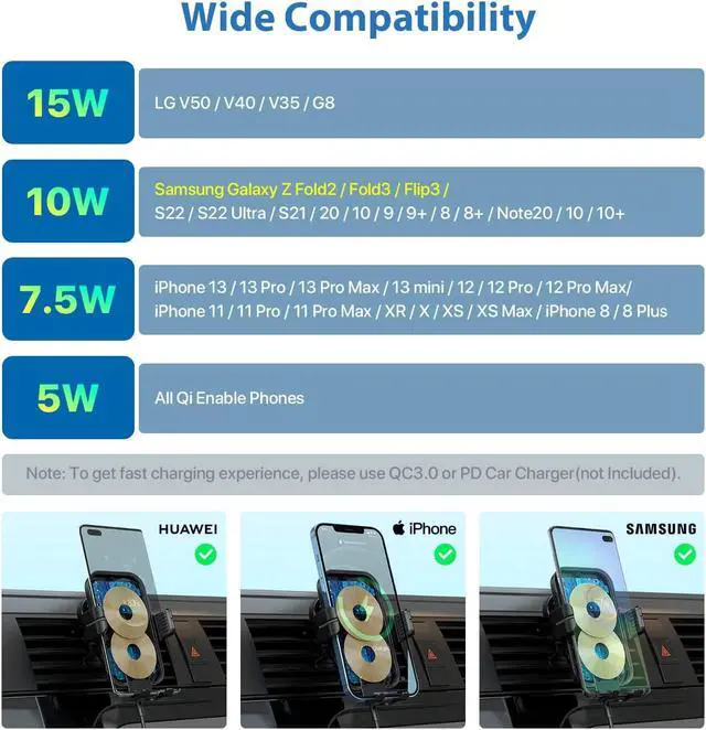 15W Fast Wireless Charging: Compatible with almost Qi enable phones. 15W for LG V50, V40, V35, G8; 10W for Wireless Fast Charging for Samsung Galaxy W22/W21/Z Fold 3/Z Fold 2/Z Flip 3/Z Flip/S22/S22+/S22Ultra/S21/ S21+/S21 Ultra; 7.5W for iPhone 13/13 pro/12/12 pro/11/ X/XR/XS/8, it also suitable for Google Pixel 6/Pixel 6 Pro and other wireless charging phones. To get fast charging experience, please use QC 3.0 or PD Car Charger (not Included).