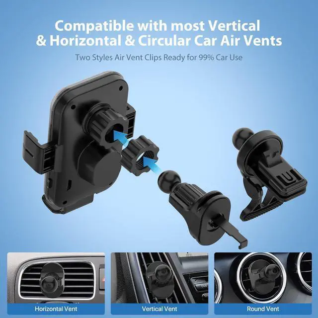 Two Styles Air Vent Clips & Adjustable Bottom Tray: With two styles Air Vent Clips, you can install with your Car Air Vent at your favor, which is Compatible with 99% Vertical & Horizontal and Circular Air Vents of Car. Adjustable Bottom Tray is designed for different big size phones.