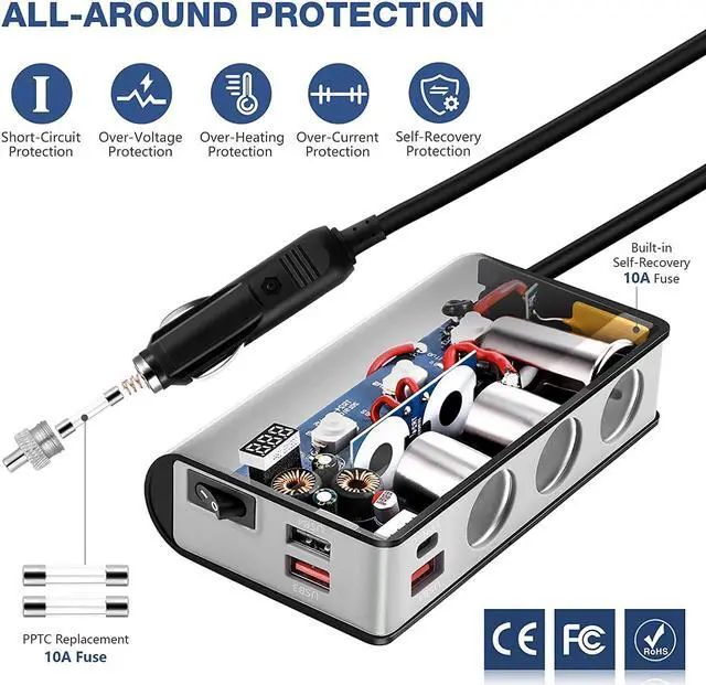 Upgrade Cigarette Lighter Adapter - 7 devices can be charged at same time. Three 12V/24V car charger adapter sockets provide a total power up to 180W, and single socket power is not exceed 100W. Which perfectly fits with your GPS, dash cam, SatNav, seat heater, cooler box, handheld vacuum cleaner and so on. Internal Smart IC technology intelligently detects your devices to deliver optimal current.