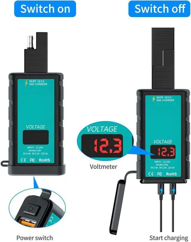 Voltmeter & SwitchBuilt-in voltage indicator helps you monitor the battery voltage and electrical system in real time. With the power button, we can turn off the motorcycle USB fast charger when not in use, so it won't drain the battery.