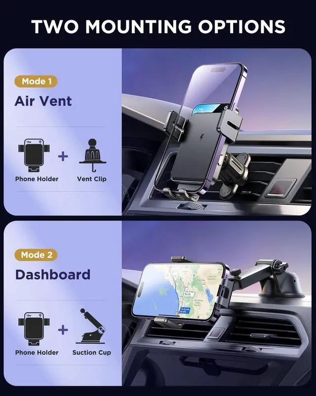 2 In 1 DesignCombines the wireless phone charger & car phone mount allowing for a secure hands-free experience. Keep you away from the tangled locating cords or cables. Joyroom car phone holder mounts charger is suitable for Windshield, Dashboard, and Air Vent installation, and makes GPS and phone calls more convenient.