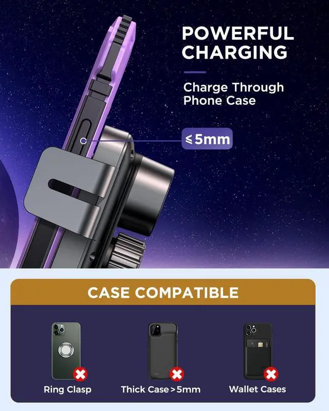 Flexible Angle & Case Friendly With a retractable & foldable bracket and 360° rotatable head, it never blocks your driving sight, you can adjust it to a position that makes you comfortable. Joyroom car mounts wireless charger supports charging through phone cases up to 5mm thick. Please note that cases made of metal, external attachments such as magnets, credit cards, grips, and stands will interfere with charging.