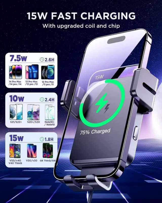 Qi Wireless Car Fast Charger Qi certificated, the 7.5W for iPhone 14 pro max/14 pro/14/14 Plus/13 pro max/13 pro/13/12 series/11 series /SE /XS /X/XR/8 Plus/8. And other Qi-enabled cell phones with up to 5W standard charging. 15W wireless car charger mount is for LG V50/V40/V30+/V30/V40, ThinQ G8/G8S/G7; 10W for Samsung Galaxy S20+/S20/Note 10+/Note 10/S10+/S10;