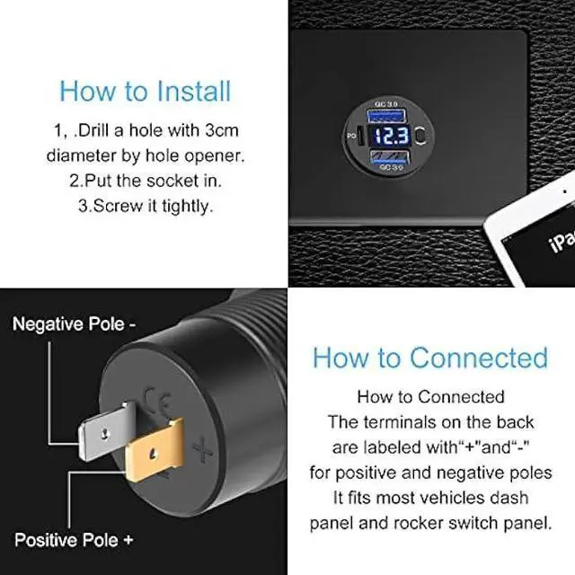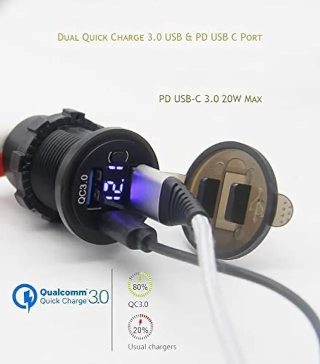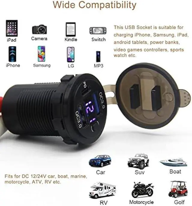 Universal CompatibilityPerfect for Car Marine Motorcycle Golf Cart ATV RV etc. Supports all mobile phones, tablets, Video Games Controllers, Power Banks and more. (NOTE: PD port does not support laptops charge)