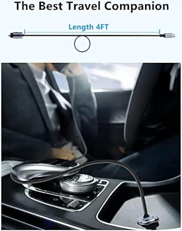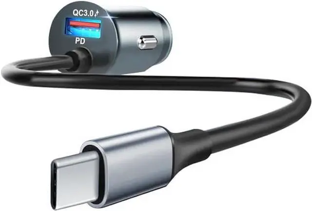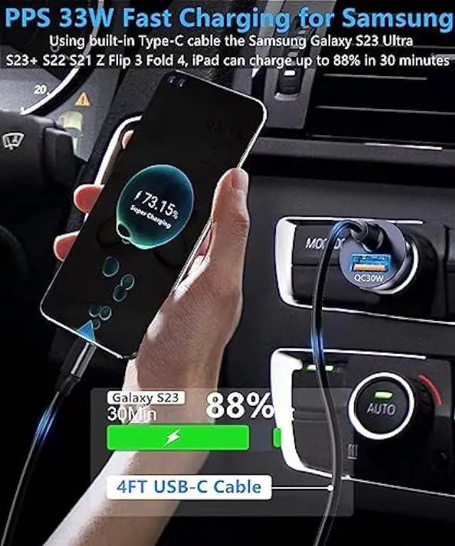 CONVENIENT BUILT-IN 4FT TYPE-C CABLE & LED LightAiming to offer more convient driving experience, this type C car charger attached a 4ft super fast USB-C Cable featured Anti-break SR and enduring more than 40, 000+ times bending test without break, support super fast charging up to 30W, perfect compatible with all android & USB C device. What's more, soft blue LED light helps to plug USB cable and pull out this car usb charger in the dark.