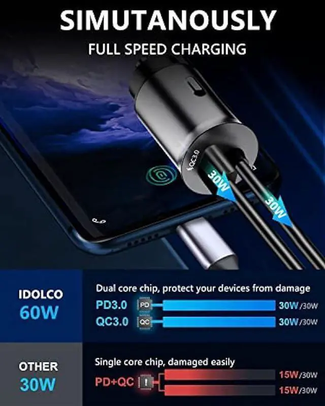 SUPER FAST CAR CHARGER PD30W+QC30WIDOLCO 60W USB C car charger supporting PD 30W (Max) and QC 30W (Max) high output, 4X faster than 2.4A charger, can fast charge all prevailing phones at the same time. The PD 30W Type-C cable can provide super fast charging for Note 20/10/10+, Galaxy S22/21/20 with highest speed, etc. The 30W Quick Charge 3.0 port can fast charge most Android devices from 0% to 80% in 30 minutes, achieving unprecedented charging speed.
