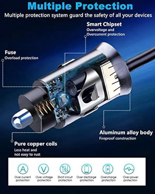 FAST CHARGING TWO DEVICES SIMULTANEOUSLYBuilt-in PD30W&QC30W dual-chip, Dual ports USB car charger fast charge, supports PD 3.0 / QC 3.0 / PPS/AFC and FCP super fast charging protocol, full-speed charging is possible. Simultaneously, the devices that do not support PD/QC will also be sent the optimal current(5V/ 2.4A Singal ports max). This Cigarette lighter USB charger can fast charge 2 devices (iPhone, iPad, Galaxy, Xperia, Android, etc. ) simultaneously without loss, total 60W for 2 ports.