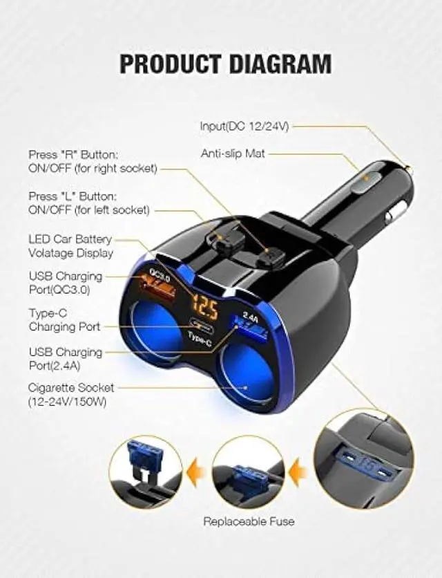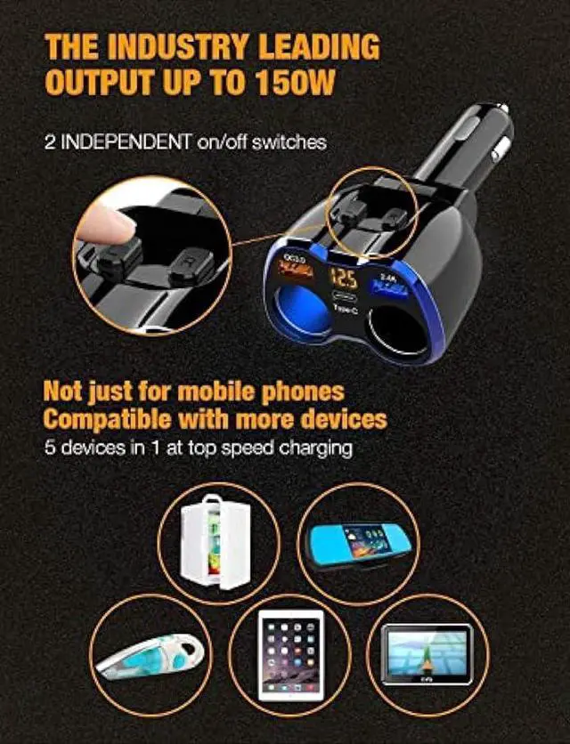 150W Power Output & Independent ON/OFF SwitchThe upgraded Cigarette Lighter Splitter provides a total power output up to 150W which ensures different devices can be charged at MAXIMUM SPEED. To reduce wear and tear, the two cigarette lighter sockets are designed with independent ON/OFF Switches. No need to unplug your chargers.