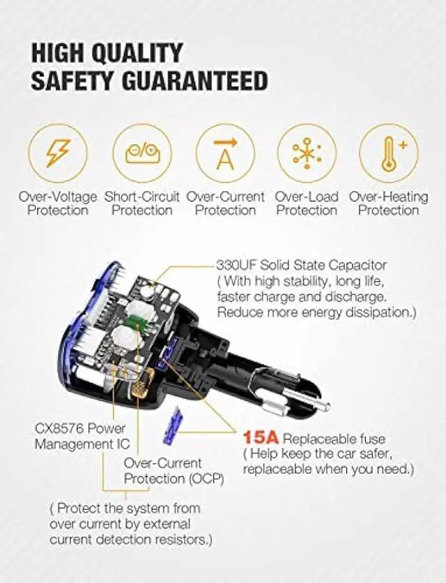 Multi Protection & LED VoltmeterThe Multi-Protect Safety System with built-in replaceable 15A fuse and smart recognition chip, cuts off the current to prevent your devices from overheating, over-current, over-voltage, and short-circuit protection. It includes a LED display for automatically monitoring your car battery once the vehicle power center is on. You get peace of mind knowing your battery life is protected.