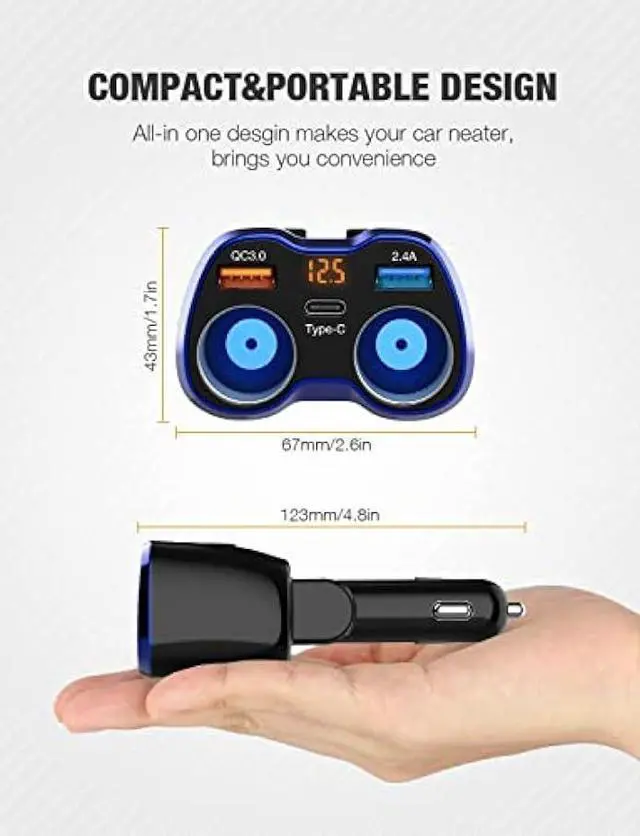 QC 3.0 Fast Charger & 5 in 1 Super Charger New upgraded Quick charge 3.0 port can charge mobile devices up to 80% in only 35 minutes which provides 4X FASTER CHARGING SPEED for compatible devices. 2.4A Smart IC USB port charges up to 2.5X faster than usual car chargers and a type c port enable you to rapidly charge two devices simultaneously. Two 12V/24V cigarette lighter sockets (maximum 120W for each socket) fit perfectly with your GPS, Dash Cam, Satnav, Satellite Radio, etc.