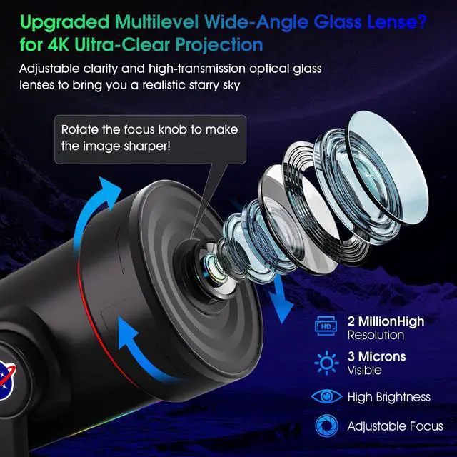 4K HD Galaxy Star ProjectorAdjustable Lens, 10 Realistic Star Maps Room DecorationMulti-Function Controls & 8-Color Night Light Super Wide Ceiling Coverage for BedroomsHome Theaters & Kids Rooms