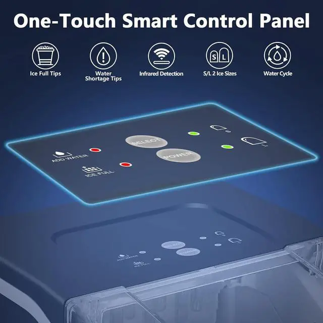 Easy to Control: The one-touch control panel is very easy to operate. Simply fill the ice machine maker countertop with water, press the on button, and select the size of the ice bullets. The indicator light comes on when there is a lack of water or when the ice basket is full. A sensor automatically detects when the ice is full and stops production to prevent overflow. Ice baskets can be easily removed to deliver ice. The transparent lid allows you to monitor the ice capacity