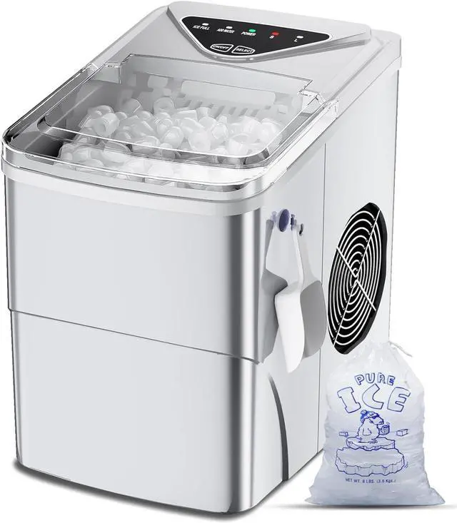 Quiet & User Friendly: With its silent running, the noise of this small ice maker is lower than 40 dB, similar to a working refrigerator. Complete with an ice bag, eliminating the need to buy ice and saving money effortlessly when have this ice machine.