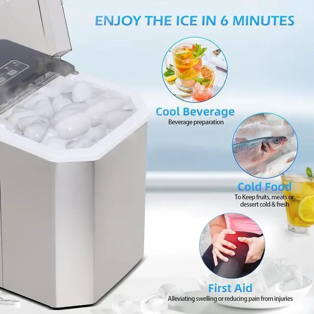 Experience the ultimate in fast ice making with our Ice Maker. This countertop appliance is designed to produce 9 bullet-shaped ice cubes in just 6-10 minutes, ensuring you have a quick and steady supply of ice. With a daily ice production capacity of 26 lbs, you'll never run out of ice for your drinks or cooling needs.