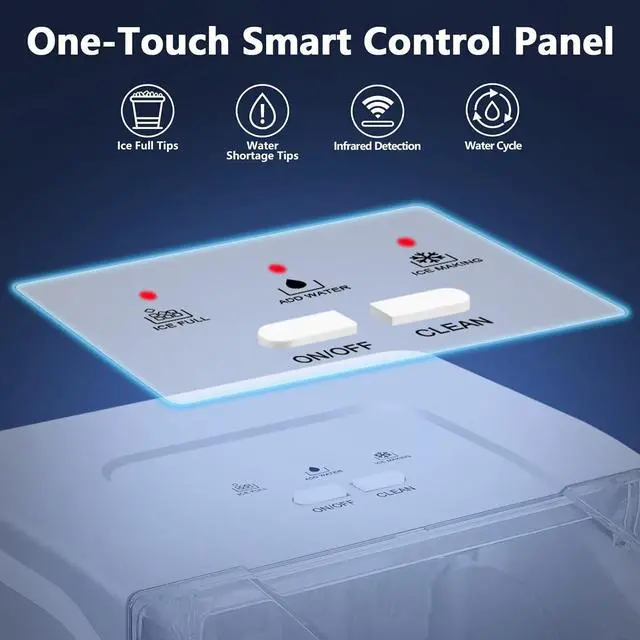 User-Friendly & Simple Operation The ice machine is super easy to use with one-click button to start. Intelligent infrared sensor with ADD WATER and ICE FULL Indicators, it will alarm you when lack of water or ice reaches the Max. At the same time, the ice maker machine will auto-stop to prevent damage and overflow.