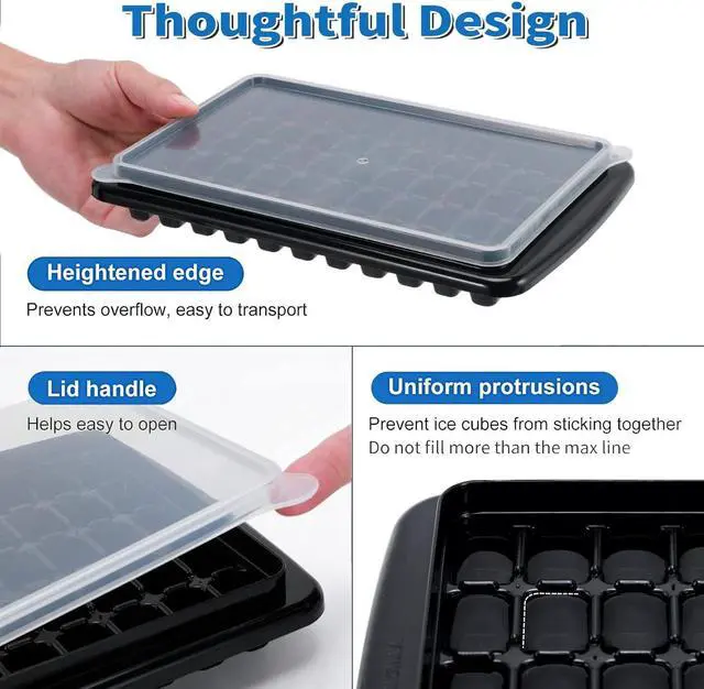 Ice Cube Tray with Lid: The lid and The edges of the tray are designed higher for easy filling and easy transporting, not easy to spill. (note: not sealed). Dont fill above the max fill line to keep ice cubes in the perfect nugget shape.