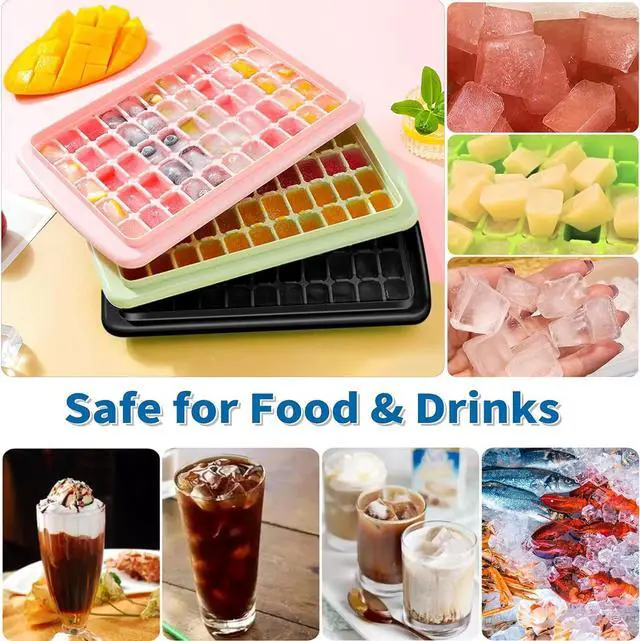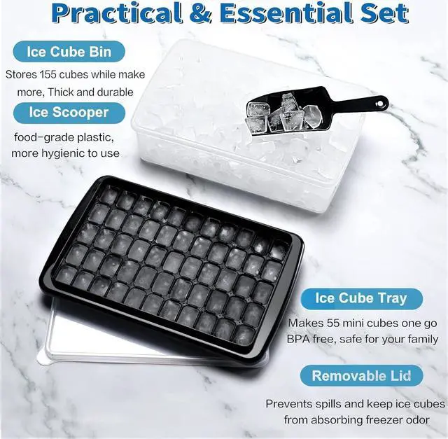 Perfect Small Ice Cubes: This Ice cube mold & tray makes 55 mini nugget ice cubes each time, the ice box can holds 3 trays of cubes. So you can enjoy ice coffee or cocktails at any time. Great for RV, home use, and parties. Our ice cube trays can also be used in making Miniature dessert, such as Jelly, chocolate, baby food, frozon yogurt, perfect size for ice chewer.
