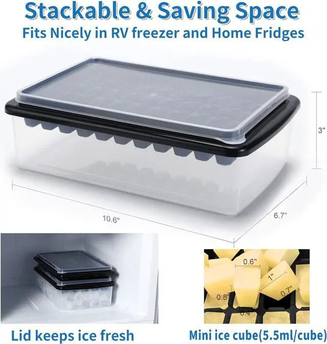 Stackable Ice Tray with lid and Bin: Space-saving master. Perfect compact size is 10.6 (L) x 6.7 (W) x 3 (H) inches, fits nicely in RV refrigerator and Home Fridges. This 3 in 1 set includes: 1 ice cube tray with lid, 1 storage container, 1 ice scooper.