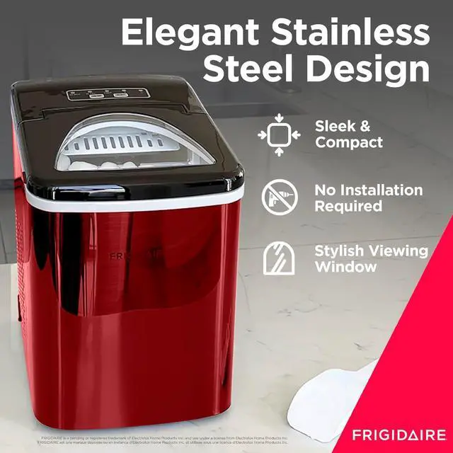 Frigidaire Red Stainless Steel Ice maker - produces 26 pounds of ice per day - and ice in as little as 6 minutes. Fast ice produces 9 cubes of ice every 7-15 minutes so you will always have a cold drink ready to goStore up to 1.5 lb. of ice in the interior basket. Inside reservoir holds 2.3 quarts of water.