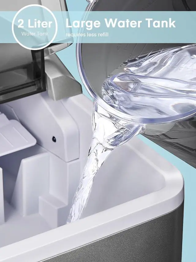 Fast to Make Ice CubesThe NORTHCLAN ice maker takes 5 mere minutes to make a single fresh batch of 9 crystal bullet-shaped ice cubes and up to 30lbs of ice per day. with 2 liter/68 oz water tank and 0.8 kg/ 1.6 lbs removable ice basket, covering a family's ice needs for 2 days.