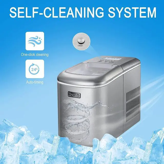 Self-Cleaning Ice Maker- press the Clean button, then press the Start/Stop to start 150s automatically cleaning function. Drain plug at the bottom, easy to empty unused water. The ice machine will kick out more pure and healthy bullet-shaped ice cubes effortlessly for you