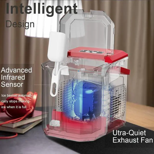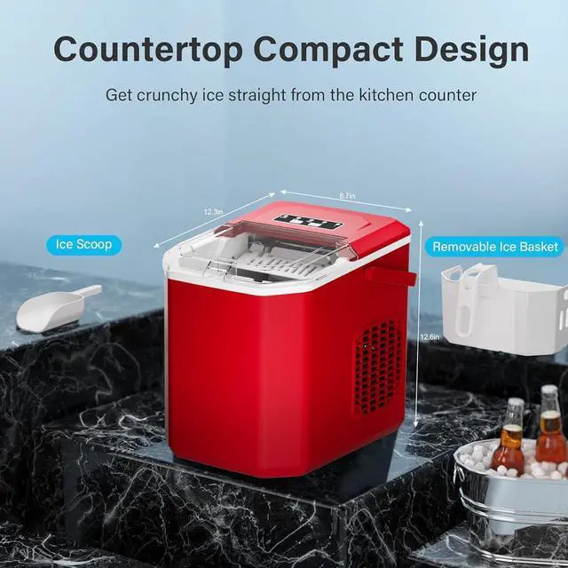 Compact Design & QuietThis countertop ice maker has a compact design and takes up little space, making it perfect for home countertops (size: 11 x 9 x 11 inches). If place it in the office pantry, you dont have to worry about noise at all (the noise is less than 35 decibels).