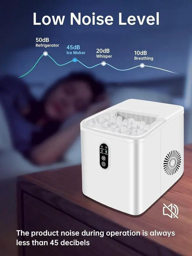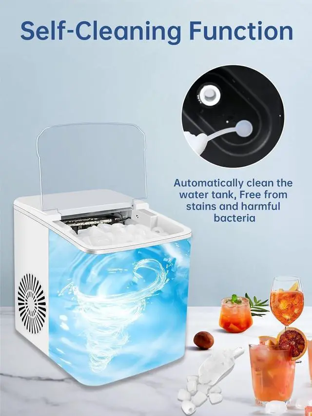 Self-Cleaning & Low NoiseThis self cleaning ice maker comes with a self-cleaning function, noise level less than 45 decibels, making it a quiet space that won't disturb your daily life. Self-Cleaning will be activated when you press the on/off button on the ice maker for 3 seconds, A drain on the bottom, just drain the water tank by open the spout.