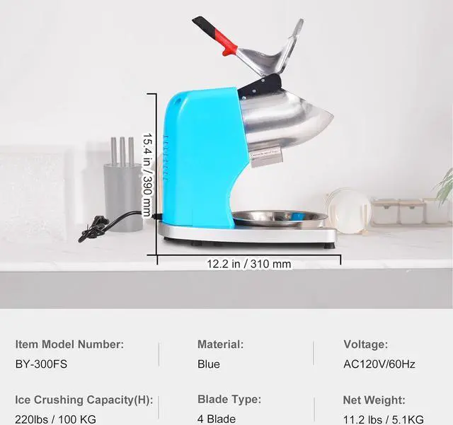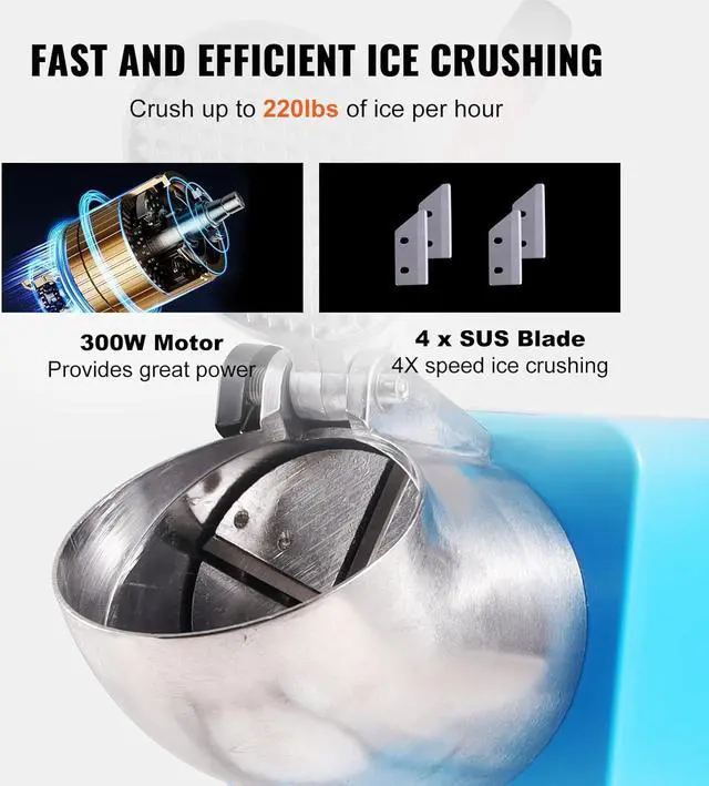 Efficient Ice Crushing: Our electric ice crusher has been upgraded with a stainless steel 4-blade head, which allows for 4 times the speed of ice crushing. The 300W motor provides sufficient power, capable of crushing up to 220 lbs of ice per hour. With our ice crusher, you can make a large amount of fluffy shaved ice in just a few minutes to meet everyone's needs.