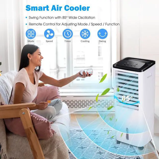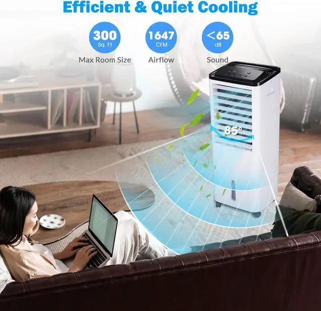 - Efficient Cooling - Evaporative Air Cooler features 1647CFM airflow for transforming water into cool breeze to lower the surrounding temperature and increase air flow, also serves as a humidifier for producing wind with cool vapor to increase the humidity, ideal for enjoying refreshing breeze in living room, bedroom, garage, workshop, etc