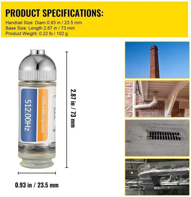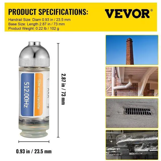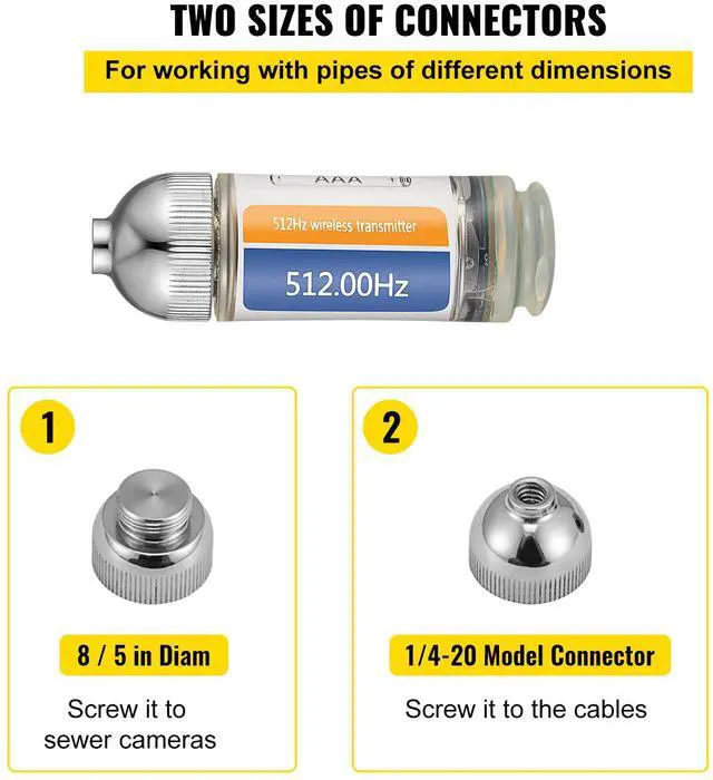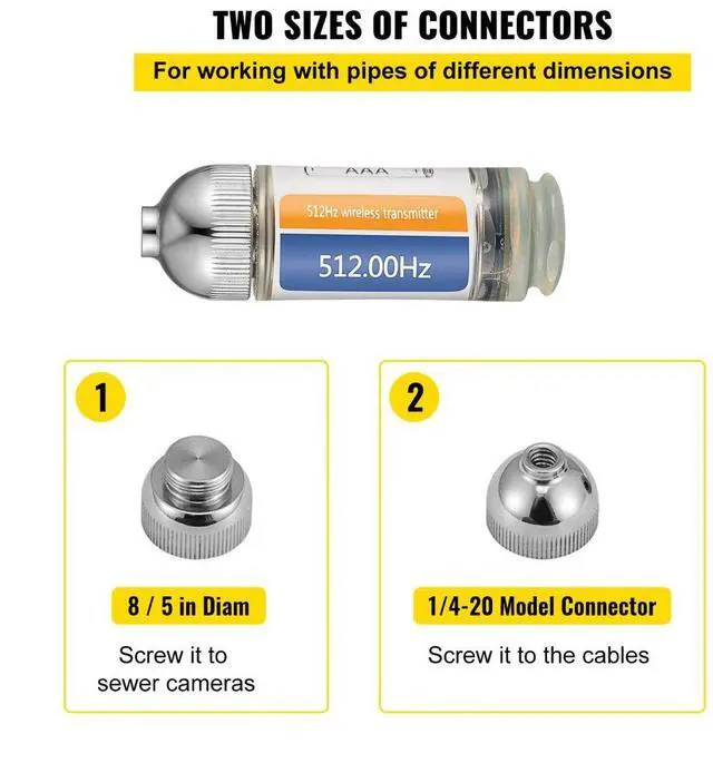 VEVOR 512HZ Sonde 8/5" and 1/4-20" Connectors Rigid Drain Locator for Locating & Detecting Small Sewer & Pipelines, Silver512HZ Transmitter304 Stainless Steel ConnectorsUniversal CompatibilityIntegrally Formed BodyPremium MaterialVersatile UsageProduct Diam: 0.93"/23.5mm,Model: VV-S-512,Product Weight: 0.22lb/102g,Product Length: 2.87"/73mm,Working Temp: -4F -130F/-20C-54C