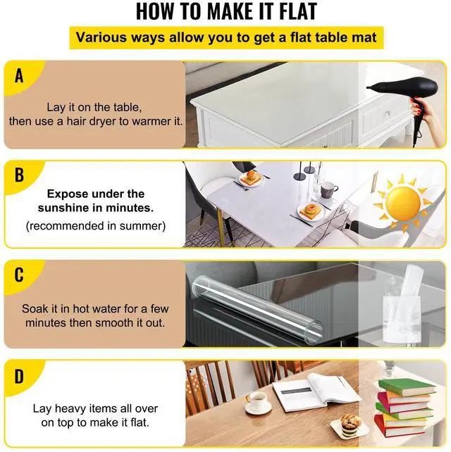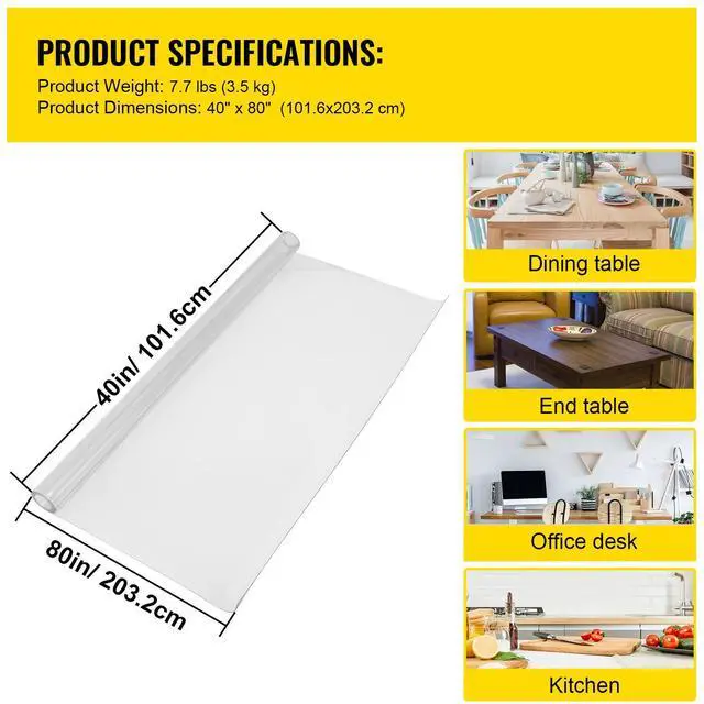 VEVOR Plastic Table Cover 40 x 80 Inch, 1.5 mm Thick Clear Table Protector, Rectangle Clear Desk Mat, Waterproof & Easy Cleaning for Office Dresser Night StandMore Secure to UseSurface ProtectionEasily Cut to FitHow to Get Flat2 Tablecloths for YouVarious ApplicationThickness: 1.5 mm,Shape: Rectangle,Tablecloth Dimension: 11.8 x 18.1 in / 30 x 46 cm,Product Dimension: 40 x 80 in / 101.6 x 203.2 cm,Max Temperature: 80 C/ 176 F,Color: Transparent,Model: SL15-FT102203,Product Weight: 7.7 lbs / 3.5 kg,Material: PVC