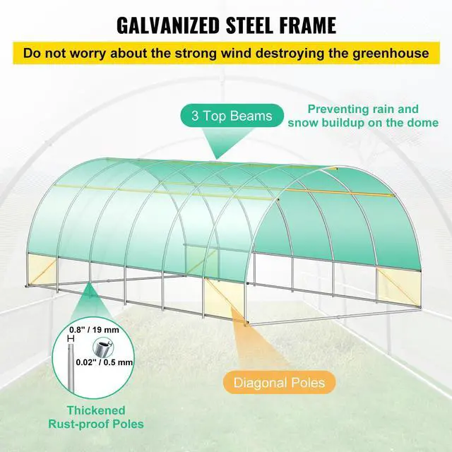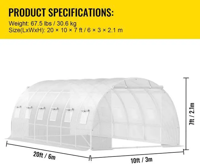 VEVOR Walk-in Tunnel Greenhouse, 20 x 10 x 7 ft Portable Plant Hot House w/ Galvanized Steel Hoops, 3 Top Beams, Diagonal Poles, 2 Zippered Doors & 12 Roll-up Windows, WhiteLarge SpaceGalvanized HoopsReinforced StructureUpgraded PE CoverEffortless InstallationVersatile UsageMesh Windows: 12,Top Beams: 3,Diagonal Poles: 4,Size: 20 x 10 x 7 ft / 6.1 x 3 x 2.1 m,Color: White,Model: VV-TG-12107WHITE,Cover Material: 140 g/cm PE,Frame Material: Galvanized Steel,Weight: 67.5 lbs / 30.6 kg