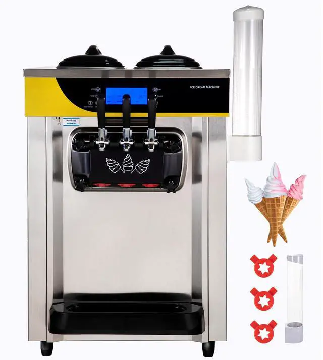 VEVOR Commercial Ice Cream Maker, 22-30L/H Yield, 2200W Countertop Soft Serve Machine w/ 2x6L Hopper 2L Cylinder LCD Panel Puffing Shortage Alarm, Frozen Yogurt Maker for Restaurant Snack Bar, Silver3 Flavors & 3 Distinct NozzlesHopper onto Another LevelBuilt-in Puffing TubesOne-click CleaningThoughtful DetailsPerfect for Various PlacesHopper Capacity: 1.6 Gal / 6 L,Refrigerant: R410a,Model: BJH288SR1B-Z,Product Weight: 187.4 lbs / 85 kg,Cylinder Capacity: 0.5 Gal / 2 L,Compressor: 1050W,Ice Cream Output: 5.8-7.9 Gal / 22-30 L per Hour,Voltage & Power: 110V / 60Hz; 2200W,Product Dimensions: 29.3" x 21.3" x 34" / 74.5 x 54 x 86 cm