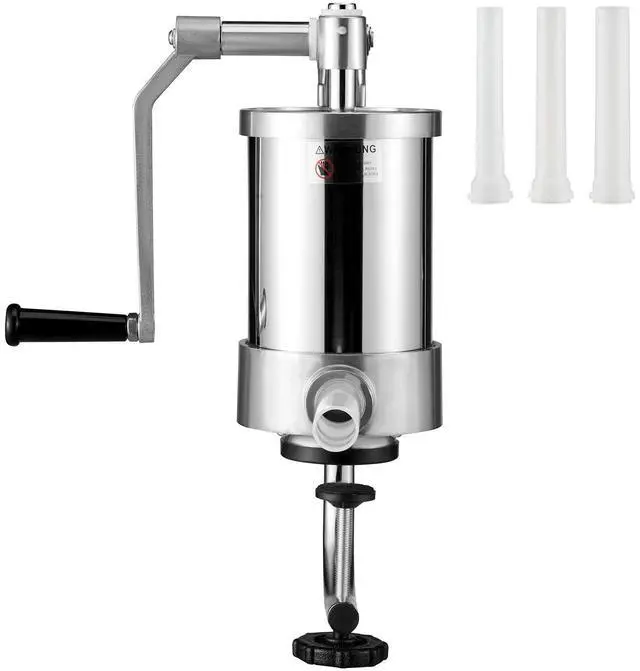 VEVOR Sausage Stuffer 2.5LBS/1.5L Capacity Homemade Sausage Maker Stainless SteelAdvanced Food-grade MaterialAir Release ValveComfortable Handle DesignThickened Sealing Piston3 Adaptable Filling NozzlesClamp Screw BaseDischarge Tube & Pressure Plate: Food-grade PP,Type: Vertical,Capacity: 0.4 Gal / 1.5 L,Overall Machine Size: 16.3 x 6 x 6.7 in / 415 x 153 x 169 mm,Model: ES-1.5L,Material Barrel: SUS304 (food grade),Operation: Manual,Tube Dimensions: 0.63 in / 16 mm, 0.75 in / 19 mm, 0.87 in / 22 mm,Net Weight: 6.3 lbs / 2.85 kg,Barrel Bottom: Aluminum (food grade)