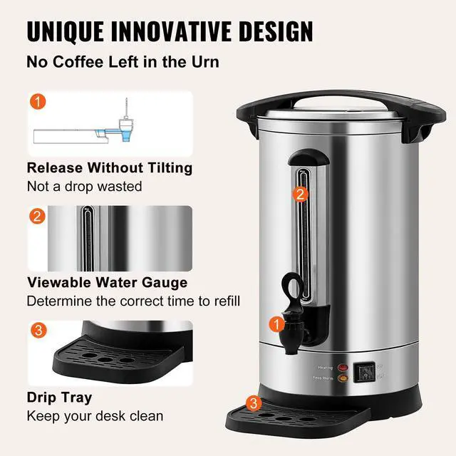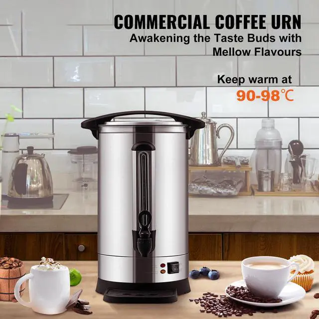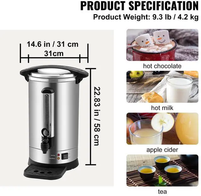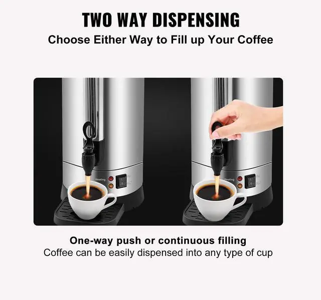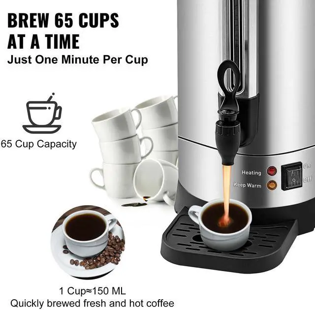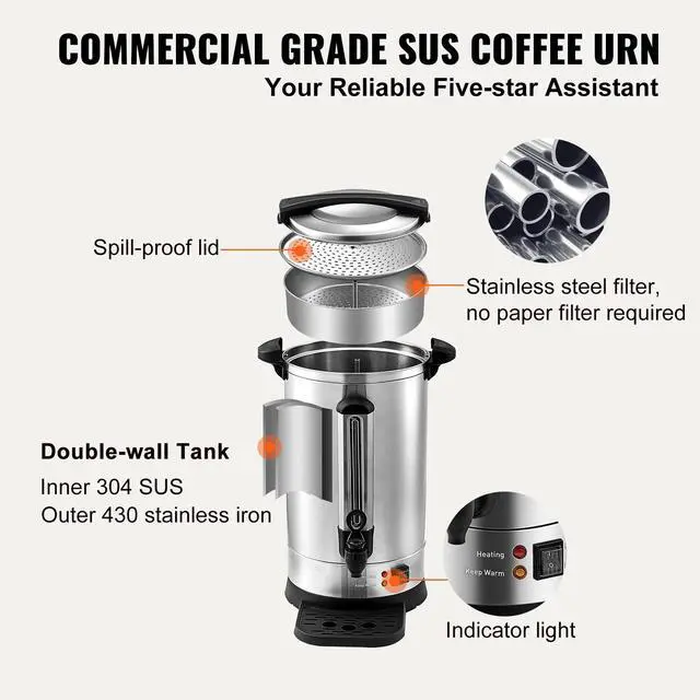 VEVOR Commercial Coffee Urn 65 Cup Stainless Steel Coffee Dispenser Fast BrewDouble-wall TankStainless Steel FilterSpill-proof LidViewable Water GaugeExquisite Body ConstructionMore than A Coffee UrnCapacity: 9.75L,Input Power: 1500W,Voltage: 120V 50/60Hz,Model: HLB100S-A2K,Dimensions: DIA.8.7 x 19.3 in / DIA.22 x 48.9 cm,Material: 304 SUS + 430 Iron,Holding Temp: 90-98,Weight: 9.3 lb / 4.2 kg