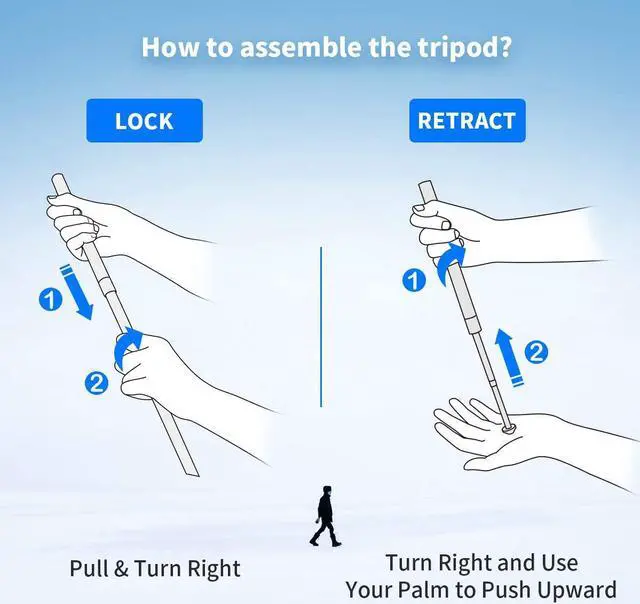 ? Locking GuideSetup: pull & turn right to lock compact tripodyou can hear tik soundretract: turn right and use your palm to push upwardJust like fold your umbrella. For any quality problem, please feel free to contact us, we will provide you with a REPLACEMENT or full refund at any time.