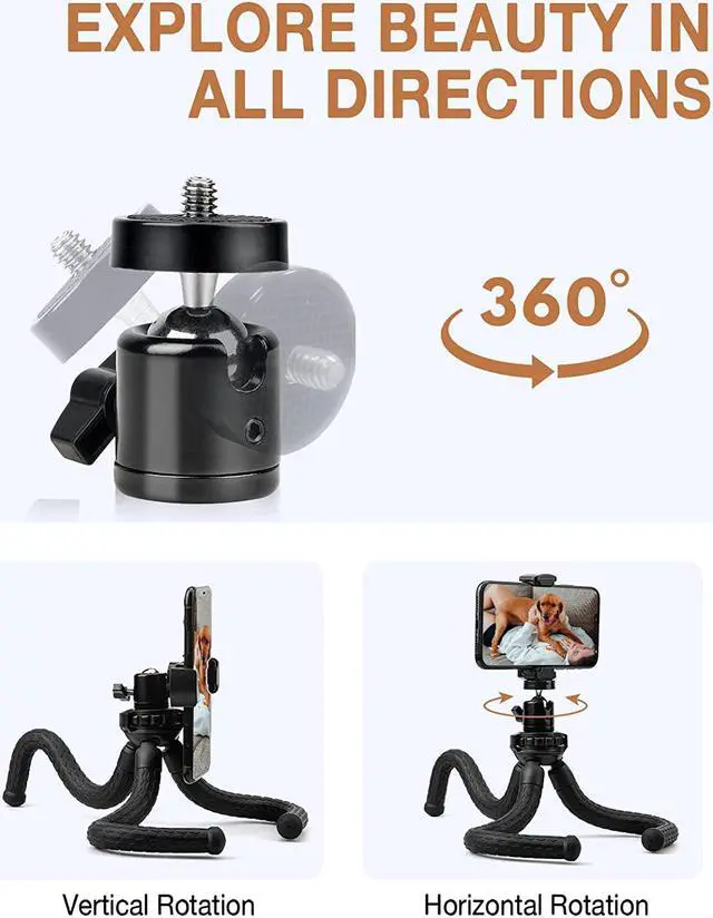 360°Spherical Head - Adjustable tripod has a ball head joint allows 360 degrees of panoramas and a 90-degree tilt. Ideal for portrait or landscape mode. Independent knobs allowing you more versatility as you capture the wonderful moment pictures.