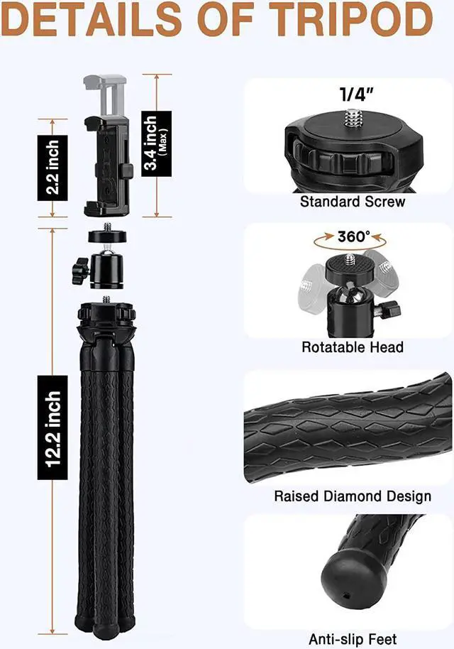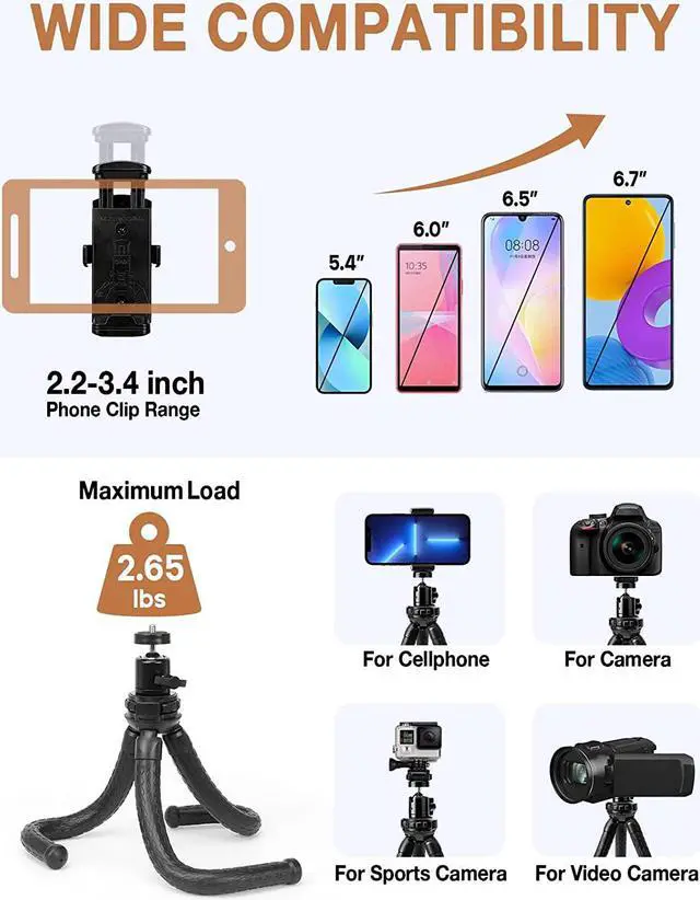 Wide Compatibility - The Universal Clip is compatible with most smartphones between 2.2 in (5.6cm) to 3.38 in (8.6 cm) such as iPhone, Samsung, Huawei, and more.The camera tripod with 1/4'' Screw on the top is perfect with Digital cameras or Action Cameras, like Nikon Canon.