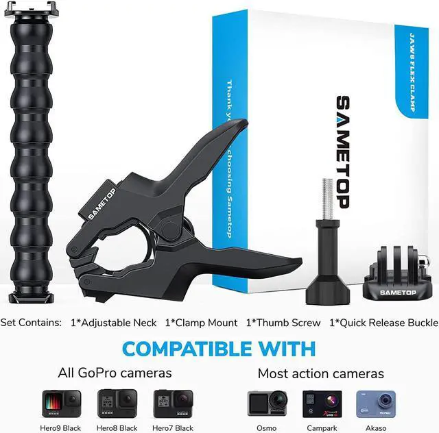 Wide ApplicationThe superpower jaws flex clamp mount could help you mount your hero on anything in size from 0.25" to 2" ( 0.6 cm to 5cm) in diameter.