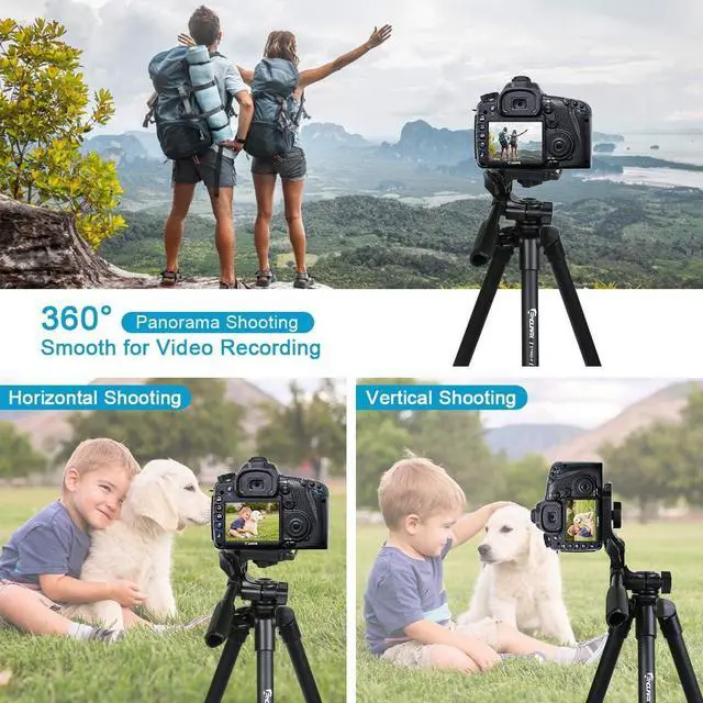 PREMIUN & HIGH QUALITY - Made of high-quality aluminum material to offer ultra durability and stability, equipped with a stable 3-way pan head and 360°rotation make this tripod fully adjustable for tilt and swivel motion, combined with the inbuilt bubble level which is awesome for photographer who need to create outstanding panorama shots. The universal 1/4 screw is included to support quickly installing the DSLR cameras.