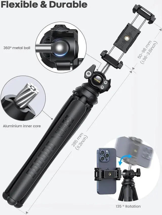 Infinitely AdjustableThis smartphone phone tripod can rotate 360° horizontally and 135° vertically. It can be adjusted to any camera angle, including horizontal and vertical modes. Tighten the screw on the side to secure the device. It can meet your diversified needs and capture every beautiful moment for you.