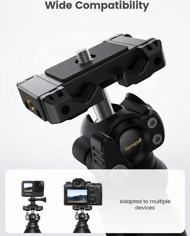 Universal CompatibilityThe 3 in 1 iphone tripod stand comes with a standard 1/4 screw for perfect compatibility with all types of small cameras. The width of the cell phone clip is 6.5 - 8.6 cm, which is suitable for 4-7 inches cell phones, such as iPhone 15/14/13/12/11 and so on. the package comes with the GoPro adapter, which adapts perfectly to the GoPro. There is also a standard screw hole on the side of the tripod for mounting a microphone or other accessories, very convenient and practical.